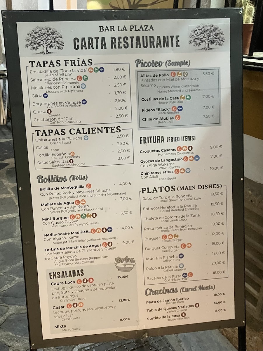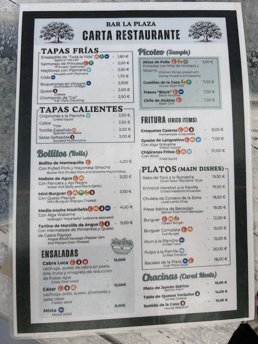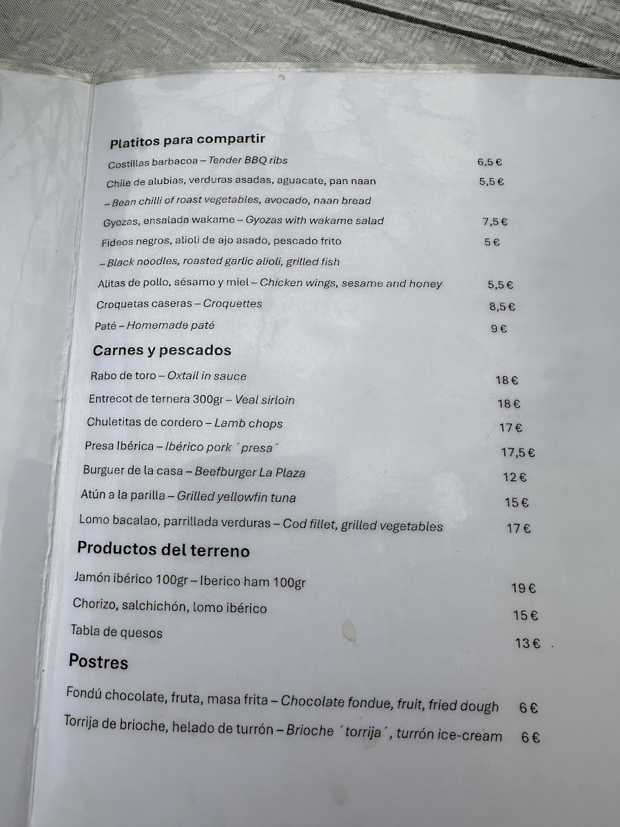 The menu’s blend of Spanish classics and inventive touches, like gyozas con salsa kimchi and fideos negros con pescado frito, fits seamlessly into Bar La Plaza’s inviting setting—whether you are settling in for a leisurely lunch under the shade of the trees or enjoying tapas and drinks as the day winds down. The food’s simple authenticity complements the welcoming atmosphere, where the focus is on relaxed moments shared among friends and locals alike.