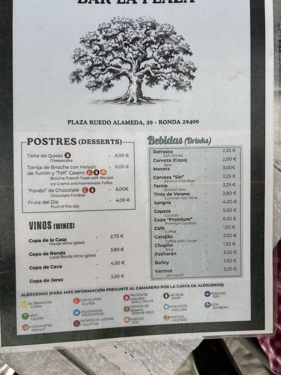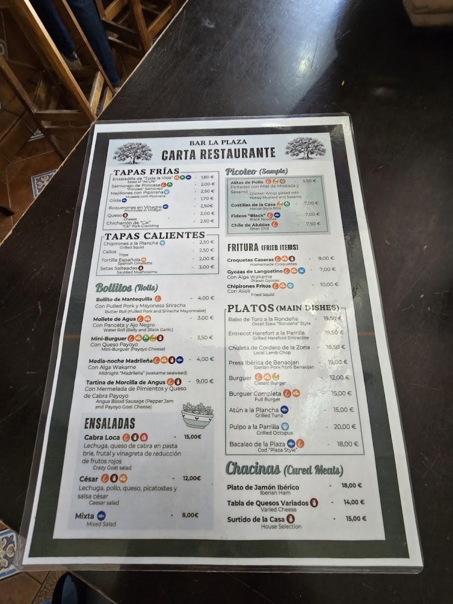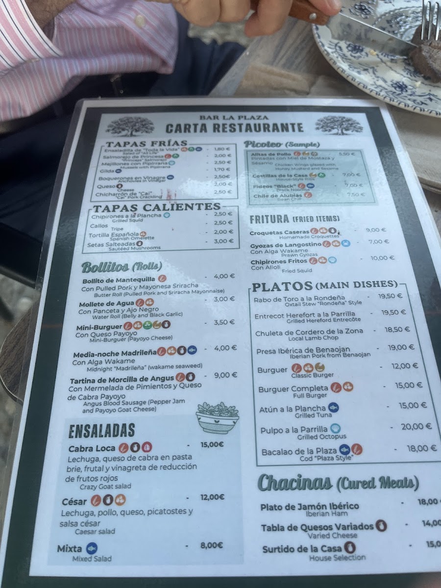 The menu’s blend of Spanish classics and inventive touches, like gyozas con salsa kimchi and fideos negros con pescado frito, fits seamlessly into Bar La Plaza’s inviting setting—whether you are settling in for a leisurely lunch under the shade of the trees or enjoying tapas and drinks as the day winds down. The food’s simple authenticity complements the welcoming atmosphere, where the focus is on relaxed moments shared among friends and locals alike.